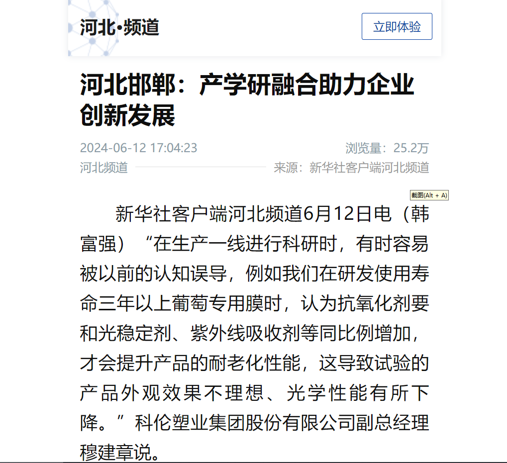 科倫塑業集團股份有限公司于2024年6月12日就公司成長歷程、產學研融合助力企業創新發展方面,公司副總經理穆建章接受新華社河北分社采訪,報道詳情如下